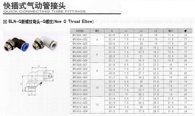 BPLN04-G01,BPLN06-G01,BPLN08-G01,BPLN10-G01,BPLN12-G01,快插式氣動管接頭