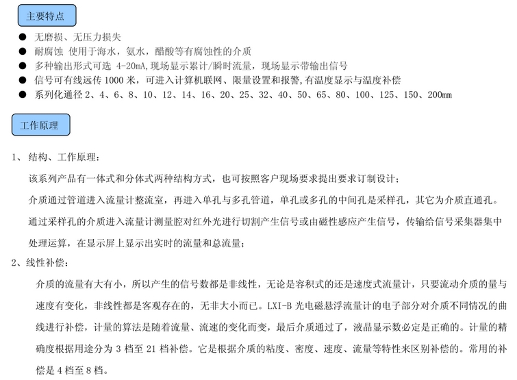 LXI-B光電磁懸浮流量儀的各項技術指標的可塑性較強,故每一套儀器都是根據(jù)用戶的具體要求而單獨定制的。要求不同,材質、零部件、性能等技術指標都不同。
