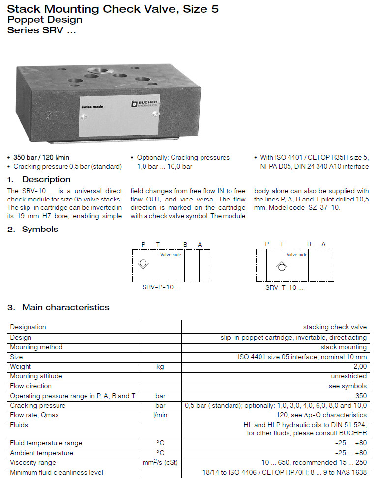 詳細信息 SRV-P-10-05,SRV-P-10-10,SRV-P-10-30,SRV-P-10-40,SRV-P-10-60,SRV-P-10-80,Bucher疊加閥