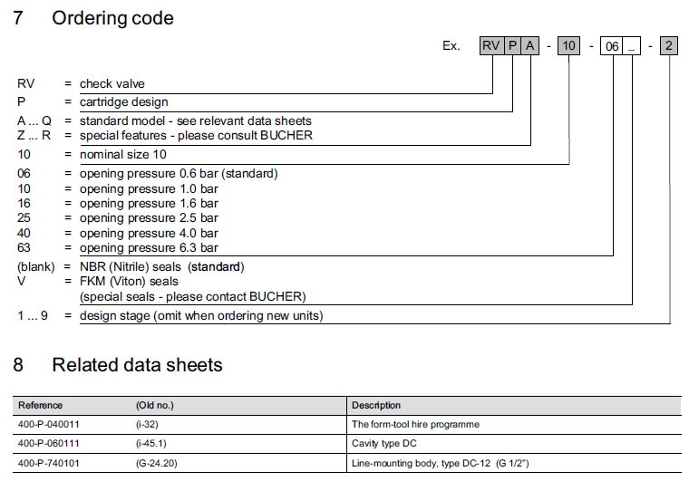 詳細(xì)信息 RVPA-10-06,RVPA-10-10,RVPA-10-16,RVPA-10-25,RVPA-10-40,RVPA-10-63,Bucher止回閥