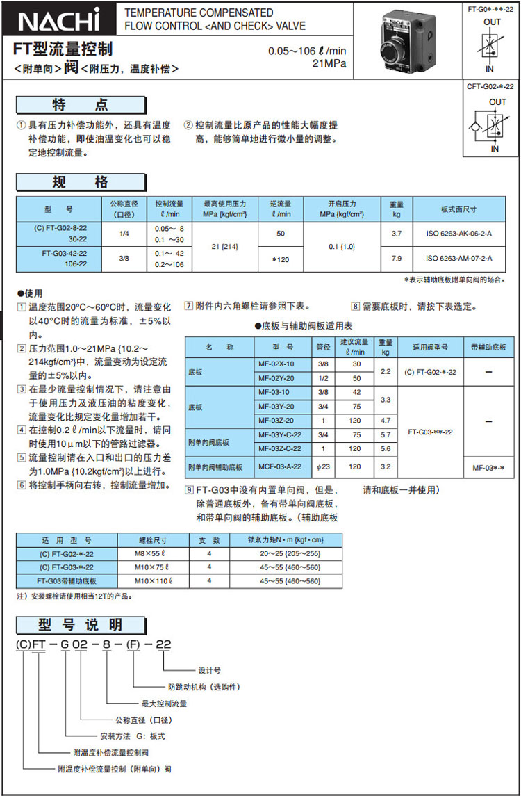 FT-G02-8-22,FT-G02-30-22,FT-G03-42-22,FT-G03-106-22,NACHI流量控制閥