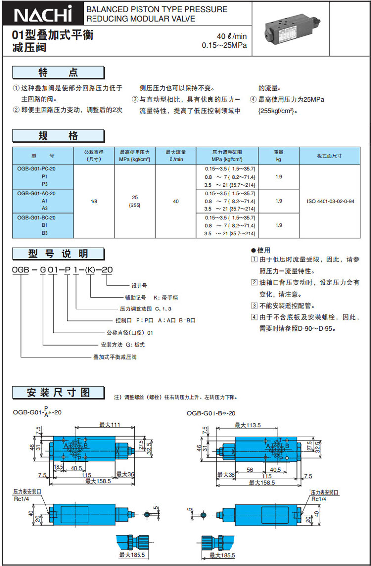 OGB-G01-PC-20,OGB-G01-A3-20,OGB-G01-B3-20,OGB-G01-P3-20,NACHI疊加式平衡減壓閥