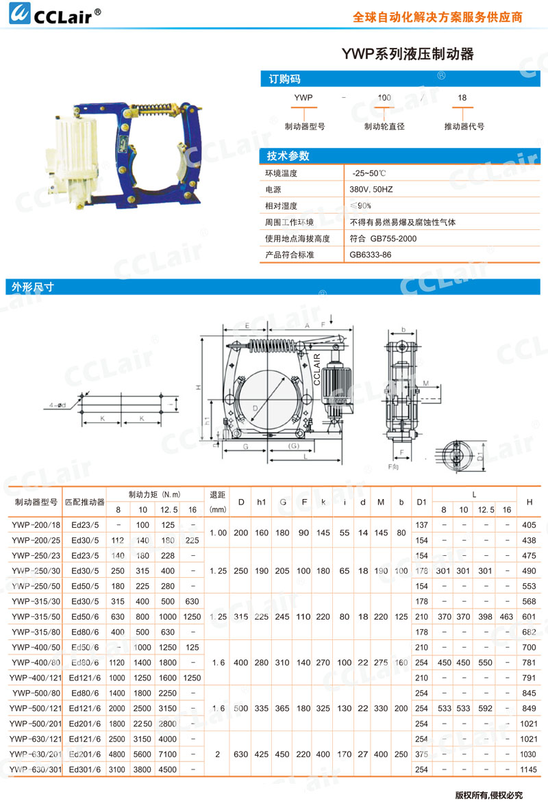 YWP-200,YWP-250,YWP-315,YWP-400,YWP-500,YWP-630,YWP-630/201,YWP-250/50,液壓制動器
