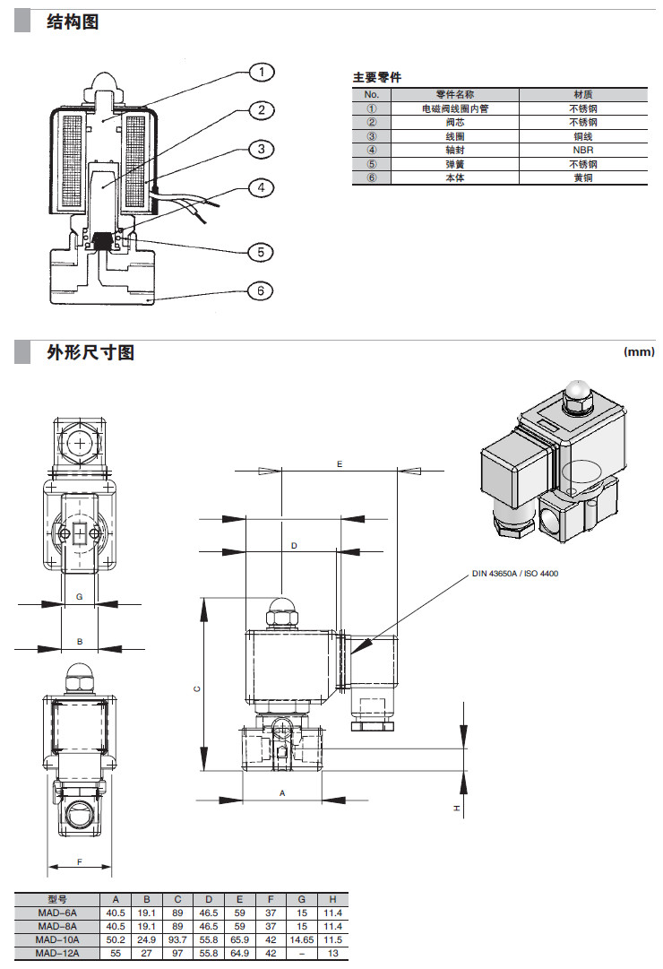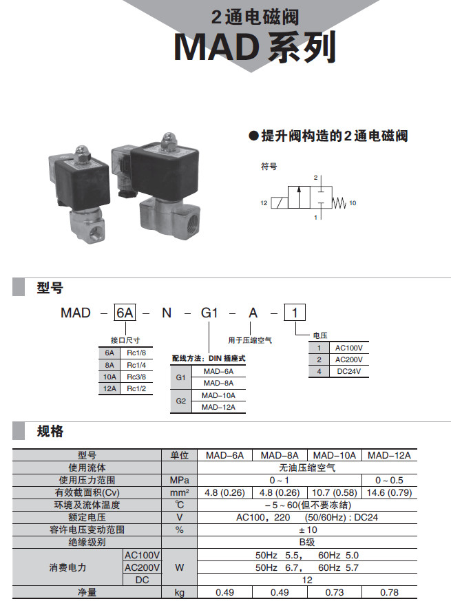 詳細(xì)信息 MAD-6A-N-G1-A-1,MAD-8A-N-G1-A-1,MAD-10A-N-G2-A-1,MAD-12A-N-G2-A-1,2通電磁閥