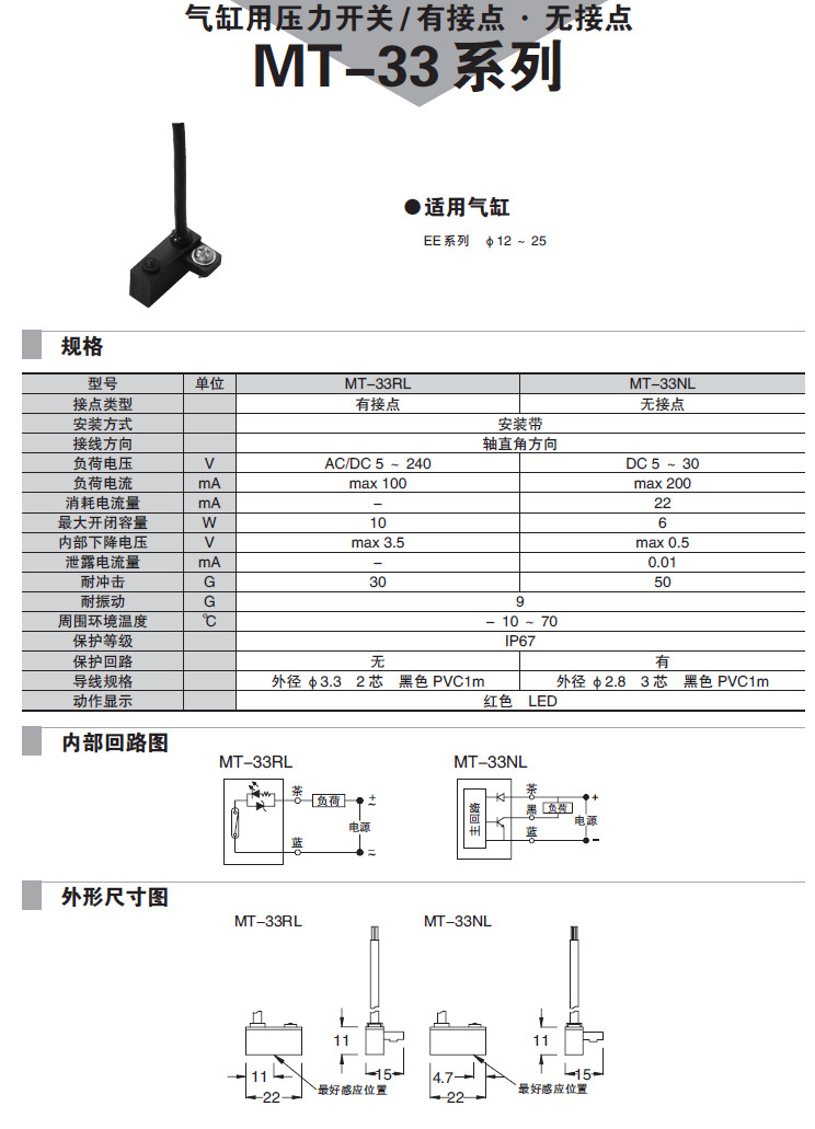 詳細(xì)信息 MT-33RL,MT-33NL,氣缸用壓力開(kāi)關(guān)