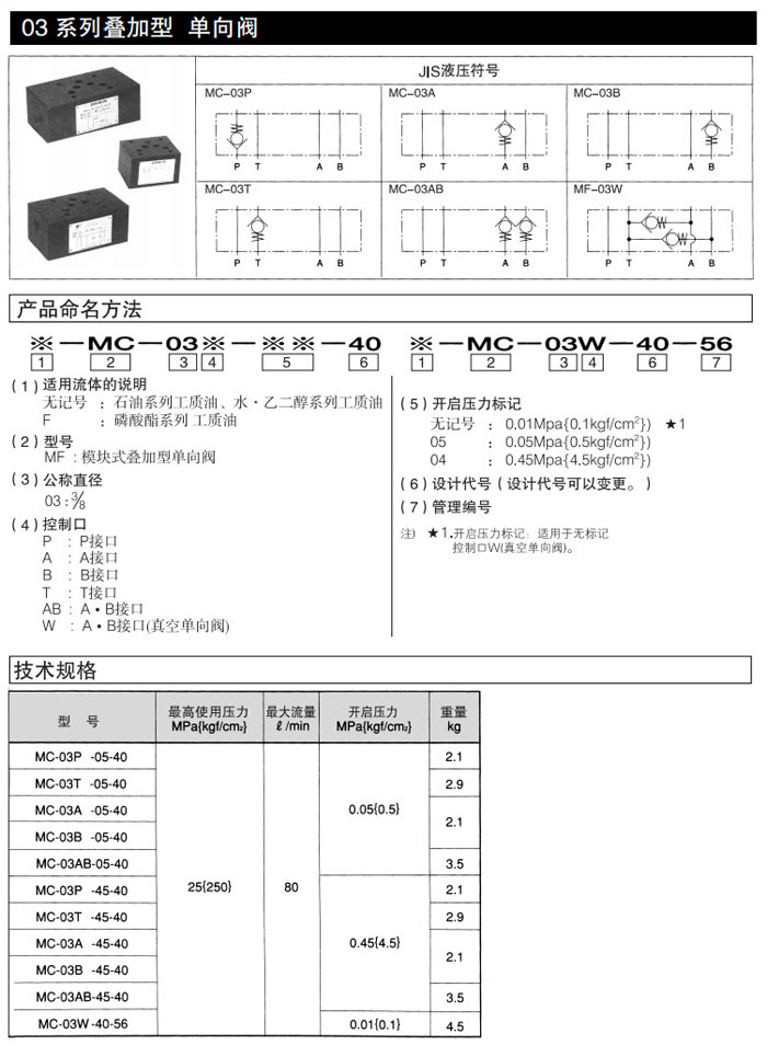 MC-03P,MC-03T,MC-03A,MC-03B,MC-03AB,MC-03W,MC-03P-05-40,MC-03W-40-56,DAIKIN疊加型單向閥