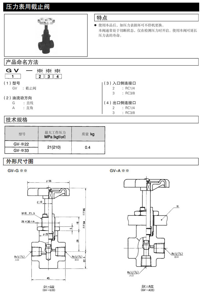 詳細(xì)信息 GV-G22,GV-A22,GV-G33,GV-A33,DAIKIN壓力表用截止閥