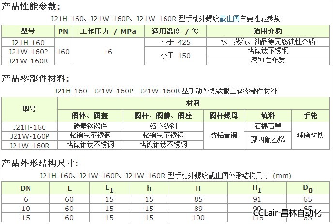J21H-160、J21W-160P、J21W-160R 型外螺紋截止閥:手動、外螺紋連接形式、直通式結(jié)構(gòu),閥座密封面材料為不銹鋼、工作壓力 16.0 MPa、公稱尺寸 DN6~DN15、閥體材料為碳素鋼(J21H)、不銹鋼(J21W),適用于水、蒸汽、油品(J21H),弱腐蝕性或腐蝕性(J21W)介質(zhì)管路中。