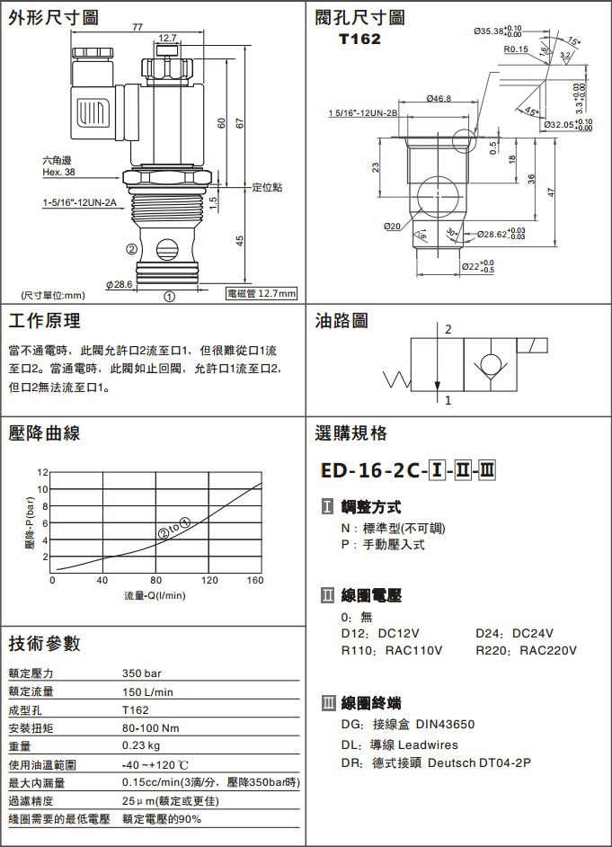 ED-16-2C-P-D24-DR,ED-16-2C-P-R220-DR,兩通常開型電磁換向閥