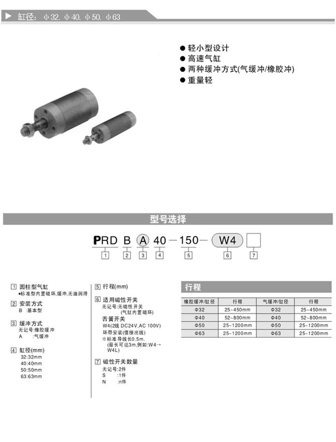 PRDB32-25,PRDB32-50,PRDB32-75,PRDBA50-75,PRDBA50-100,PRDBA50-125,圓柱形氣缸PRD