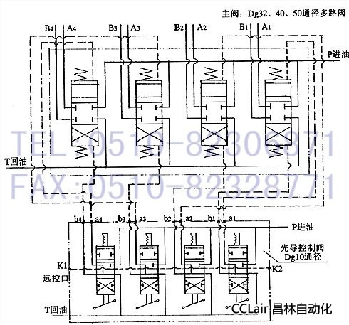 本閥具有公共進(jìn)油口P和回油口T,其油路形式為并聯(lián)油路為主。用一組Dg10通徑的多路換向閥控制操縱主閥換向。操作輕便,換向平穩(wěn)。主閥可放在離執(zhí)行機構(gòu)近處,Dg10通徑多路閥裝在操縱臺上,這樣便于安裝,減少管路。