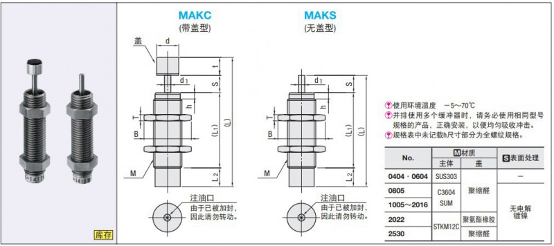 MAKC0404A,MAKC0404B,MAKC0604A,MAKC0604B帶帽,MAKC0805A帶帽,MAKC0805B帶帽,MAKC1008A帶帽,MAKC1008B,MAKC1008L帶帽,MAKC1210B帶帽,MAKC1412L帶帽,MAKC2022L,MAKS0404A,MAKS0404B,MAKS0604A,MAKS0604B,MAKS0805A,MAKS0805B,MAKS1008A,MAKS1008B,MAKS1210A,MAKS1412M,MAKS1612H,油壓緩沖器