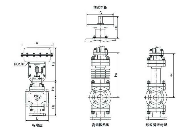 標準型-17~+230℃、散熱型+230~+450℃、波紋管密封型-40~+350℃