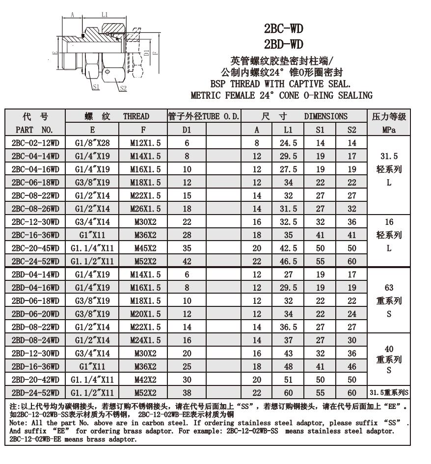 2BC-02-12WD 2BC-04-14WD 2BC-06-18WD 2BD-16-36WD 2BD-20-42WD 2BD-24-52WD 公制螺紋卡套接頭