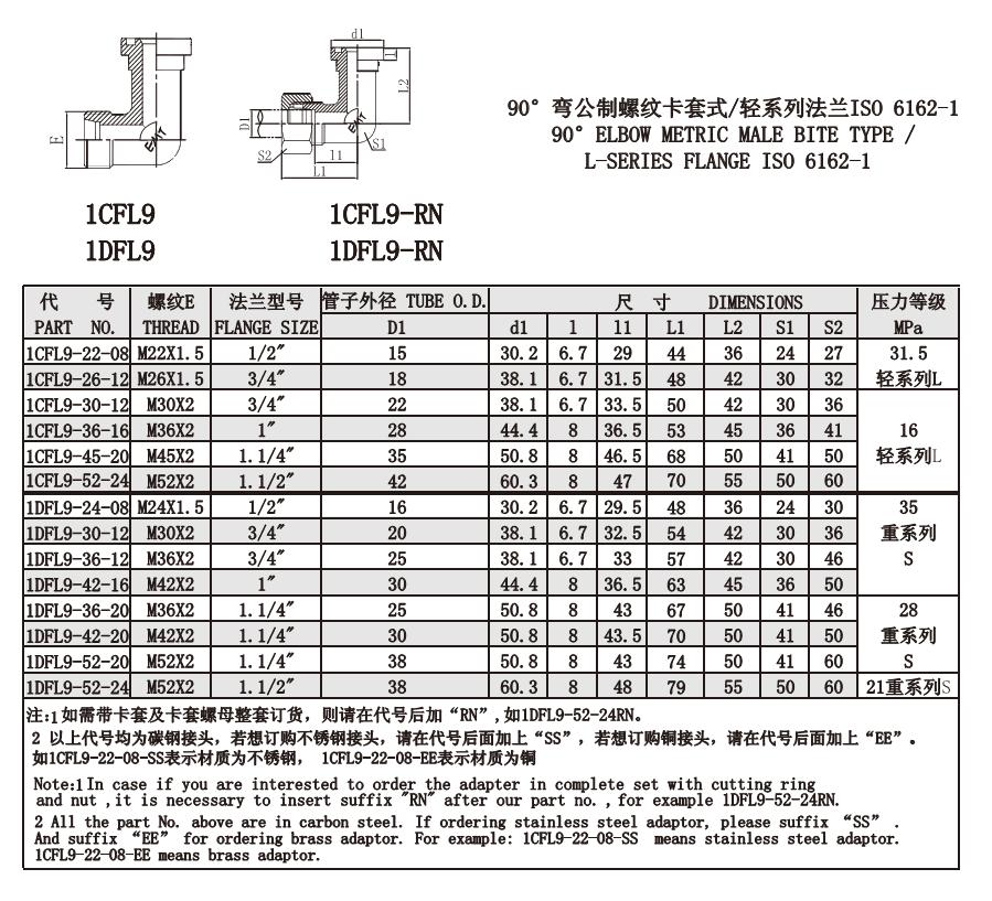 1CFL9-22-08,1CFL9-26-12,1CFL9-30-12,1DFL9-36-20,1DFL9-42-20,1DFL9-52-20,公制螺紋卡套接頭