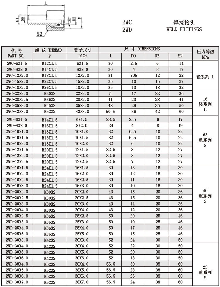 2WC-6×1.5,2WC-8×2.0,2WC-12×2.0,2WC-15×2.0,2WD-16×2.0,2WD-16×2.5,2WD-16×3.0,焊接接頭