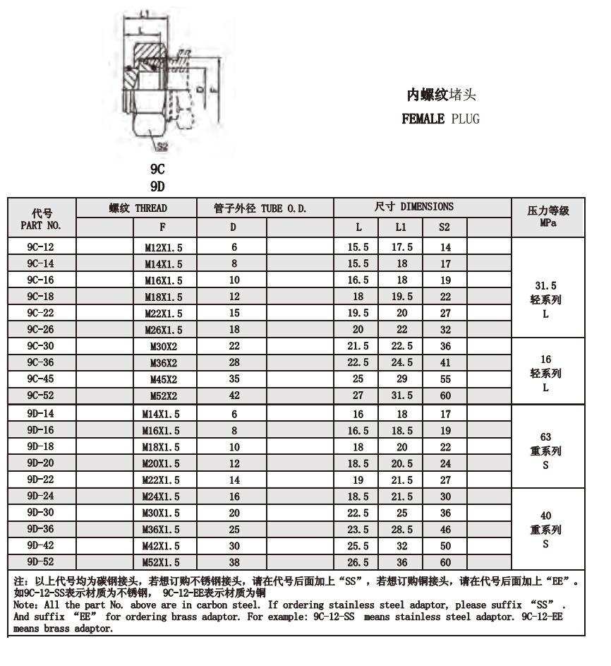 9C-12,9C-26,9C-30,9C-36,9C-45,9D-14,9C-52,9D-24,9D-30,9D-36,9D-42,9D-52,內(nèi)螺紋堵頭
