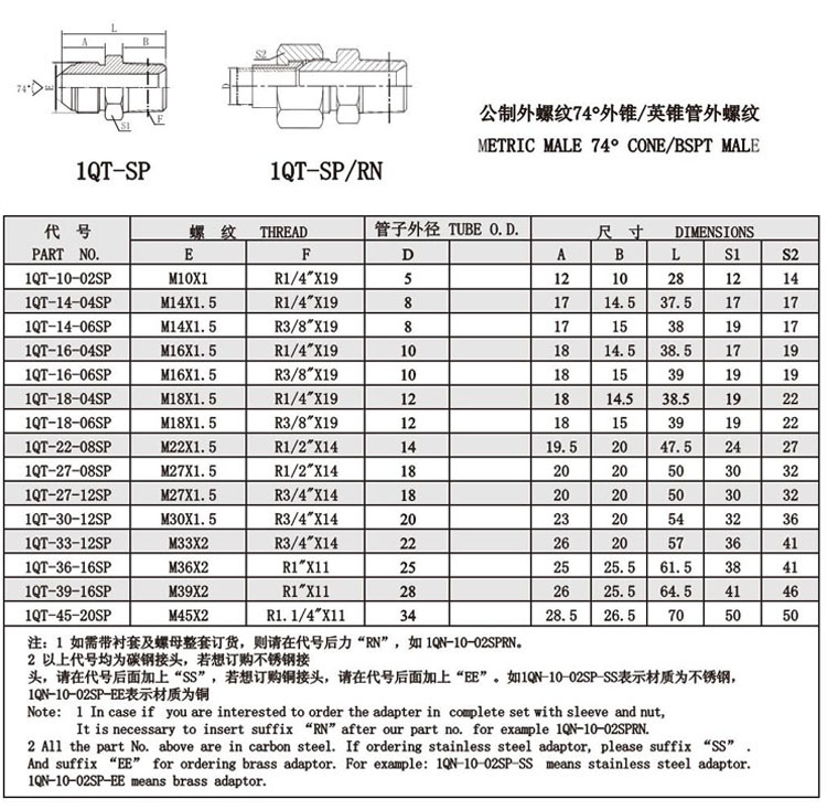 1QT-10-02SP,1QT-14-04SP,1QT-22-08SP,1QT-39-16SP,1QT-45-20SP,1QT-27-08SP,外錐/英錐管外螺紋接頭