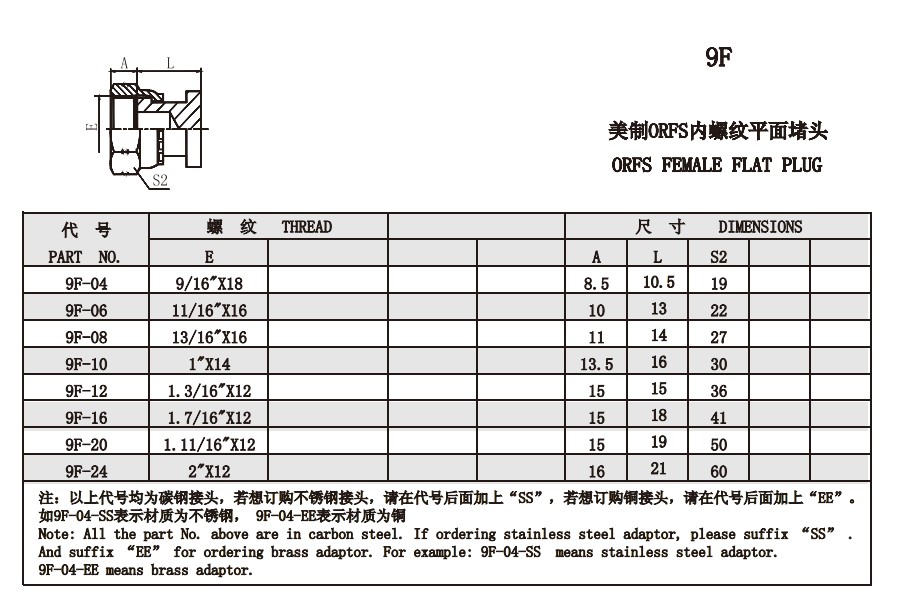 9F-04,9F-06,9F-08,9F-10,9F-12,9F-16,9F-20,9F-24,內螺紋平面堵頭