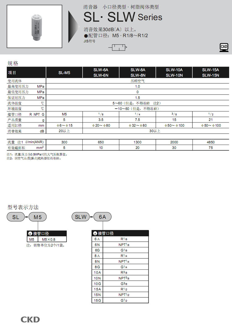 詳細(xì)信息 SL-M5,SLW-6A,SLW-6N,SLW-6G,SLW-8A,SLW-8N,SLW-8G,SLW-10A,SLW-10N,SLW-10G,SLW-15A,SLW-15N,SLW-15G,CKD消音器