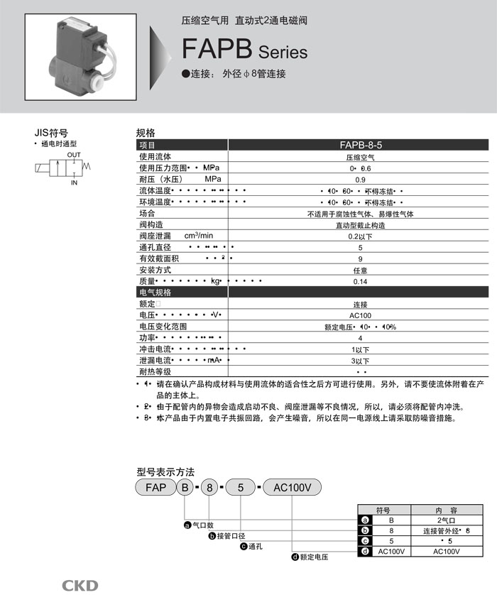 詳細(xì)信息 FAPB-8-5-AC100V,CKD直動(dòng)式2通電磁閥