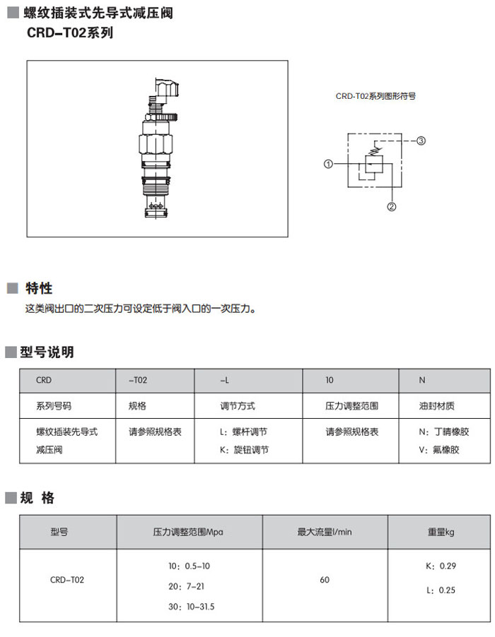 CRD-T02-L03N,CRD-T02-L10N,CRD-T02-L20N,CRD-T02-K03N,CRD-T02-K10N,CRD-T02-L30N,螺紋插裝式先導(dǎo)式減壓閥