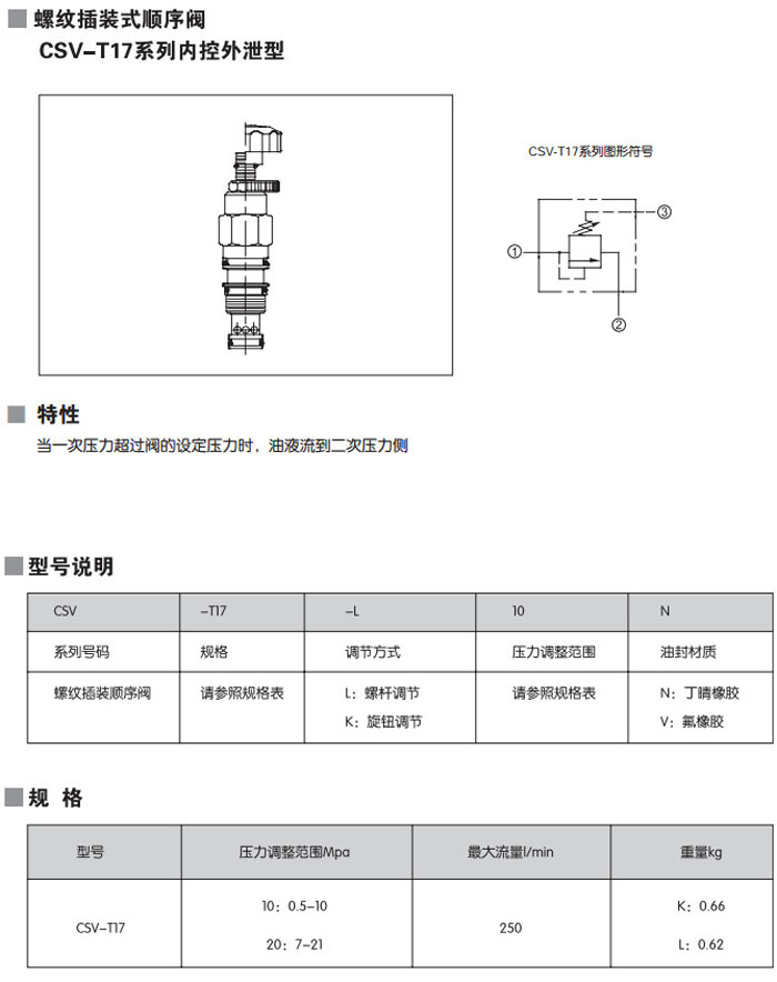 CSV-T17-L10N,CSV-T17-L10V,CSV-T17-K10N,CSV-T17-K10V,CSV-T17-L20N,CSV-T17-L20V,螺紋插裝式順序閥