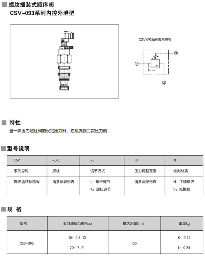CSV-093-L10N,CSV-093-L10V,CSV-093-K10N,CSV-093-K10V,CSV-093-L20N,CSV-093-L20V,螺紋插裝式順序閥
