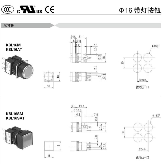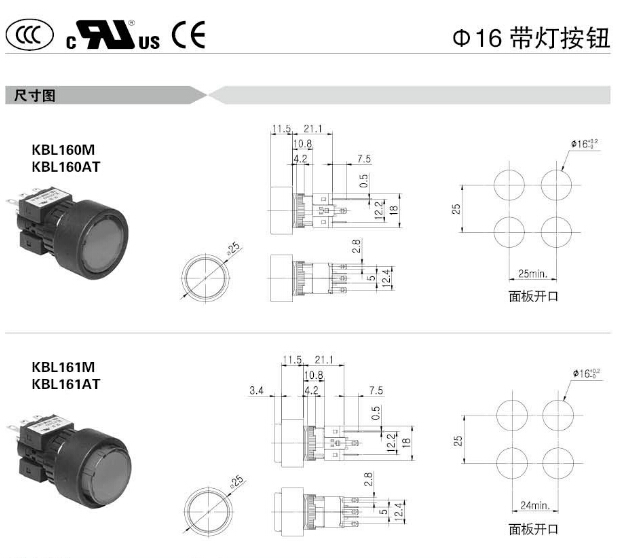 詳細信息 KBL16M,KBL16AT,KBL16SM,KBL16SAT,KBL16RM,KBL16RAT,KBL160M,KBL160AT,KBL161M,KBL161AT,Koino Φ16帶燈按鈕