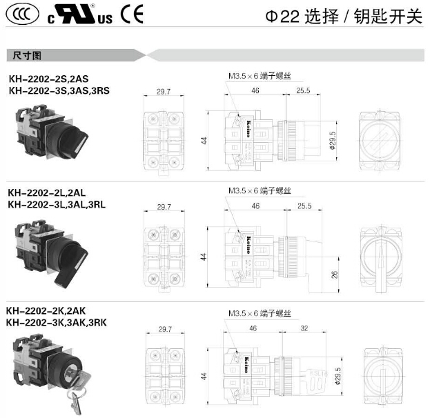 KH-2202-2S,KH-2202-2AS,KH-2202-2L,KH-2202-2AL,KH-2202-3S,KH-2202-3L,KH-2202-3RL,KoinoΦ22選擇開關(guān)