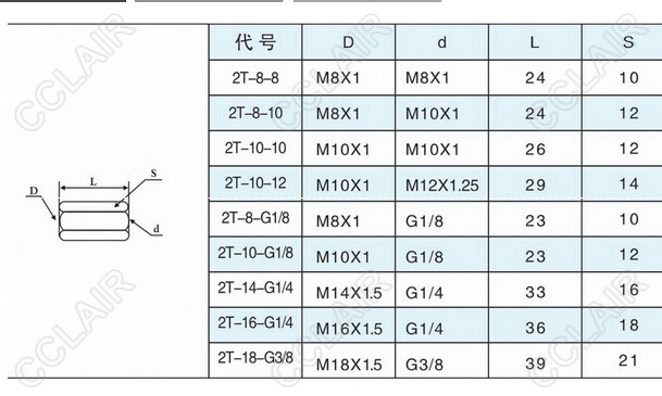 2T-8-8,2T-8-10,2T-10-10,2T-10-12,2T-8-G1/8,2T-10-G1/8,2T-18-G3/8,內(nèi)接雙通接頭
