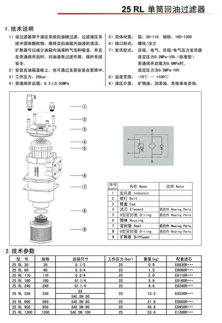 25RL30,25RL60,25RL110,25RL160,25RL240,25RL330,25RL660,25RL950,25RL1300,25RL1300KN3FAB20PD,單筒回油過濾器 |