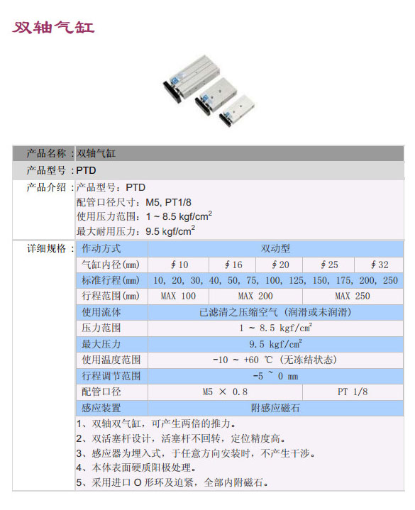 PTD-10*10,PTD-16*10,PTD-20*10,PTD-25*10,PTD-32*10,PTD-10*200,POSU雙軸氣缸 |