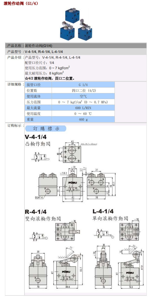 V-4-1/4,R-4-1/4,L-4-1/4,PST滾輪作動閥