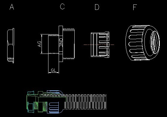 ·產(chǎn)品材質(zhì): A.C.D.F部分采用UL認(rèn)可之無(wú)鹵素(Halogen-Free)尼龍PA66(防火等級(jí)UL94V-2)制成;(可定制UL認(rèn)可的V-0防火等級(jí)尼龍?jiān)?;