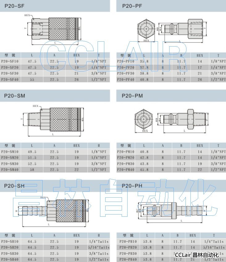詳細(xì)信息 P20-SF10,P20-PF20,P20-SM30,P20-PM40,P20-SH10,P20-PH20,美式快換接頭