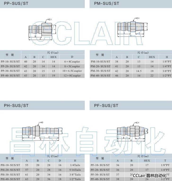 PP-10-SUS/ST,PP-20-SUS/ST,PM-10-SUS/ST,PF-10-SUS/ST,PH-10-SUS/ST,雙手操作快換接頭