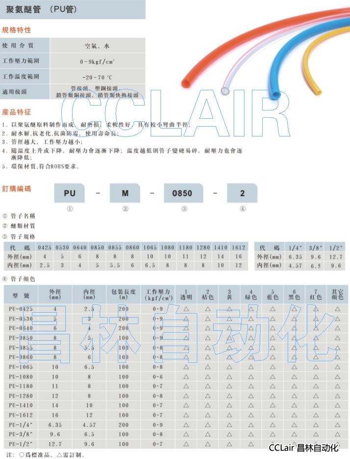 詳細信息 PU-M-0425-1,PU-M-0530-1,PU-M-0640-1,PU-M-0850-1,PU-M-0855-1,PU管