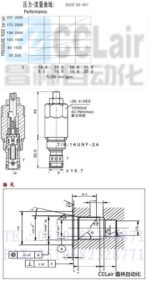 閥體P口和T口不通,直到P口壓力超過設(shè)定壓力且打開先導(dǎo)閥芯。先導(dǎo)閥芯引起主閥芯兩端壓力差的變化,壓力差達到一定時,P口和T口通。