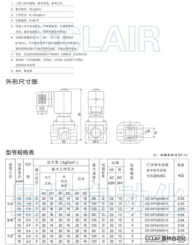 詳細信息 ZS1DF02N9B10,ZS1DF02E9B10,二位二通直動式電磁閥(常閉型)