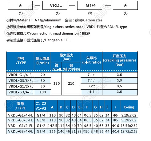 VRDL-G1/4-FL,VRDL-G3/8-FL,VRDL-G1/2-FL,VRDL-G3/4-FL,VRDL-FL,雙向液壓鎖(板式連接)
