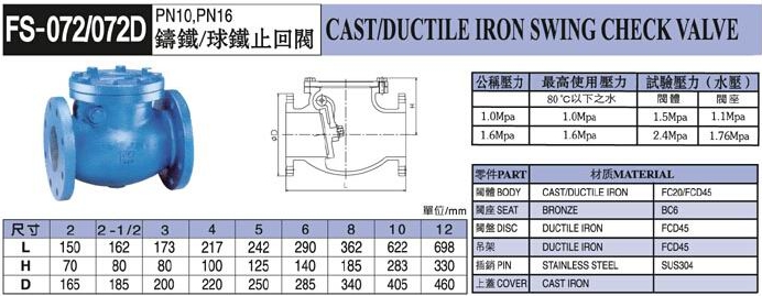 FS072鑄鐵橫式止回閥由閥體、閥蓋及橡膠瓣三種主要零件組成。其中橡膠瓣由鋼板、鋼棒及強化尼龍布作襯底,外層披覆橡膠制成,閥瓣開關(guān)壽命可達100萬次,該閥采用全流面積式設(shè)計,具有水頭損失小,不易堆積雜物,維修簡單。該閥主要適用于給排水系統(tǒng),可安裝于水泵出水口處,以防止倒流及水錘對泵損害。該閥還可安裝在蓄水池進出水管的旁通管上,以防止池水倒流至給水系統(tǒng)中。