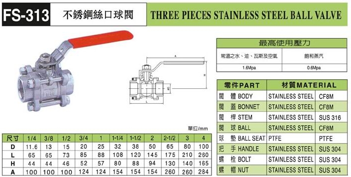 FS-313球閥是用帶有圓形通道的球體作啟閉件,球體隨閥桿轉(zhuǎn)動實現(xiàn)啟閉動作的閥門。球閥的啟閉件是一個有孔的球體,繞垂直于通道的軸線旋轉(zhuǎn),從而達到啟閉通道的目的。球閥主要用于截斷或接通管道和設(shè)備介質(zhì),也可用于流體的調(diào)節(jié)與控制,球閥流體阻力小,結(jié)構(gòu)簡單,體積小,重量輕,緊密可靠,操作方便,不會引起閥門密封面的侵蝕,適用范圍廣。