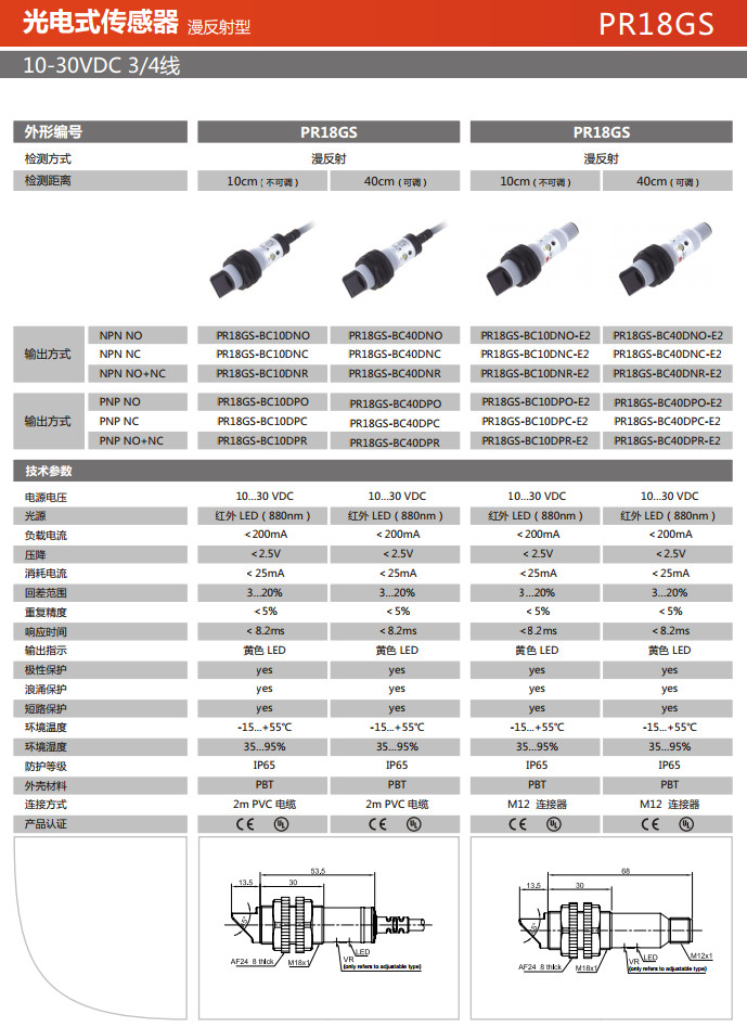 PR18GS-BC10DNO,PR18GS-BC10DNC,PR18GS-BC10DNR,PR18GS-BC10DPO-E2,PR18GS-BC10DPC-E2,光電式傳感器