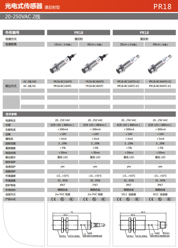 PR18-BC10ATO,PR18-BC10ATC,PR18-BC40ATO,PR18-BC40ATC,PR18-BC10ATO-E2,光電式傳感器