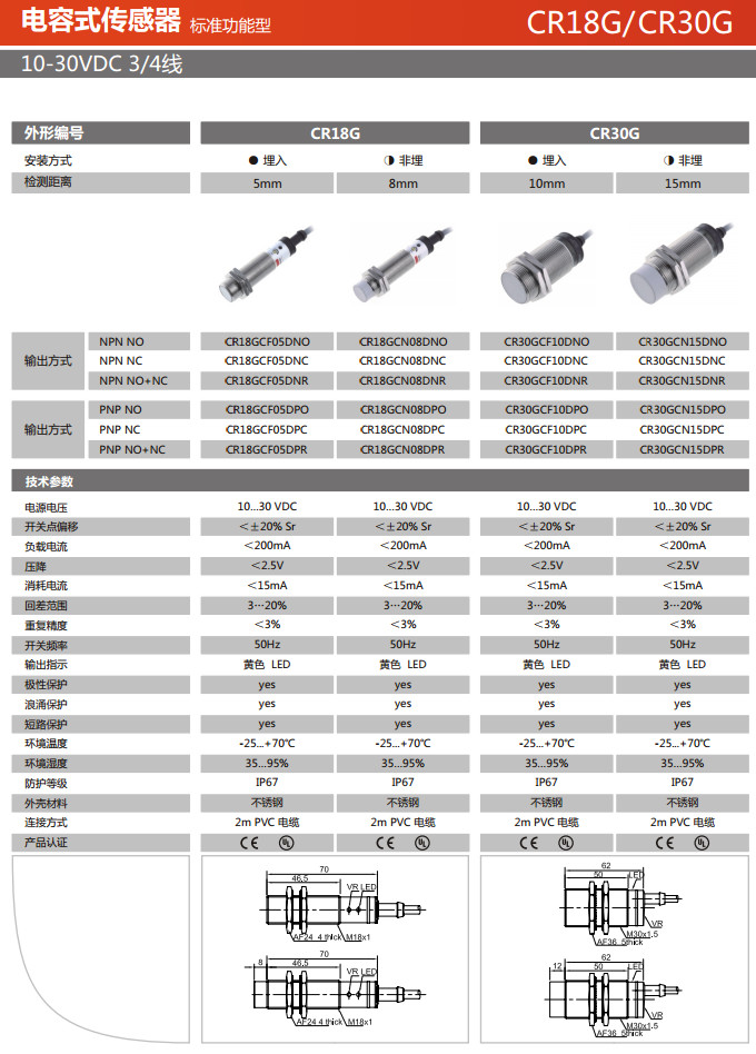 詳細(xì)信息 CR18GCF05DNO,CR18GCF05DNC,CR18GCF05DNR,CR30GCF10DNO,CR30GCF10DNC,CR30GCF10DNR,電容式傳感器
