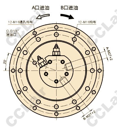 型 號 | 扭矩N.m | 轉(zhuǎn)速范圍r/min | 傳動比 | 壓力Mpa | 總排量 | 液壓馬達 | 總重 | 適用機重ton | ||||