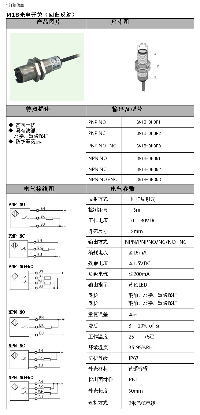 詳細(xì)信息 GM18-DH3P1,GM18-DH3P2,GM18-DH3P3,GM18-DH3N1,GM18-DH3N2,GM18-DH3N3,M18光電(回歸反射)