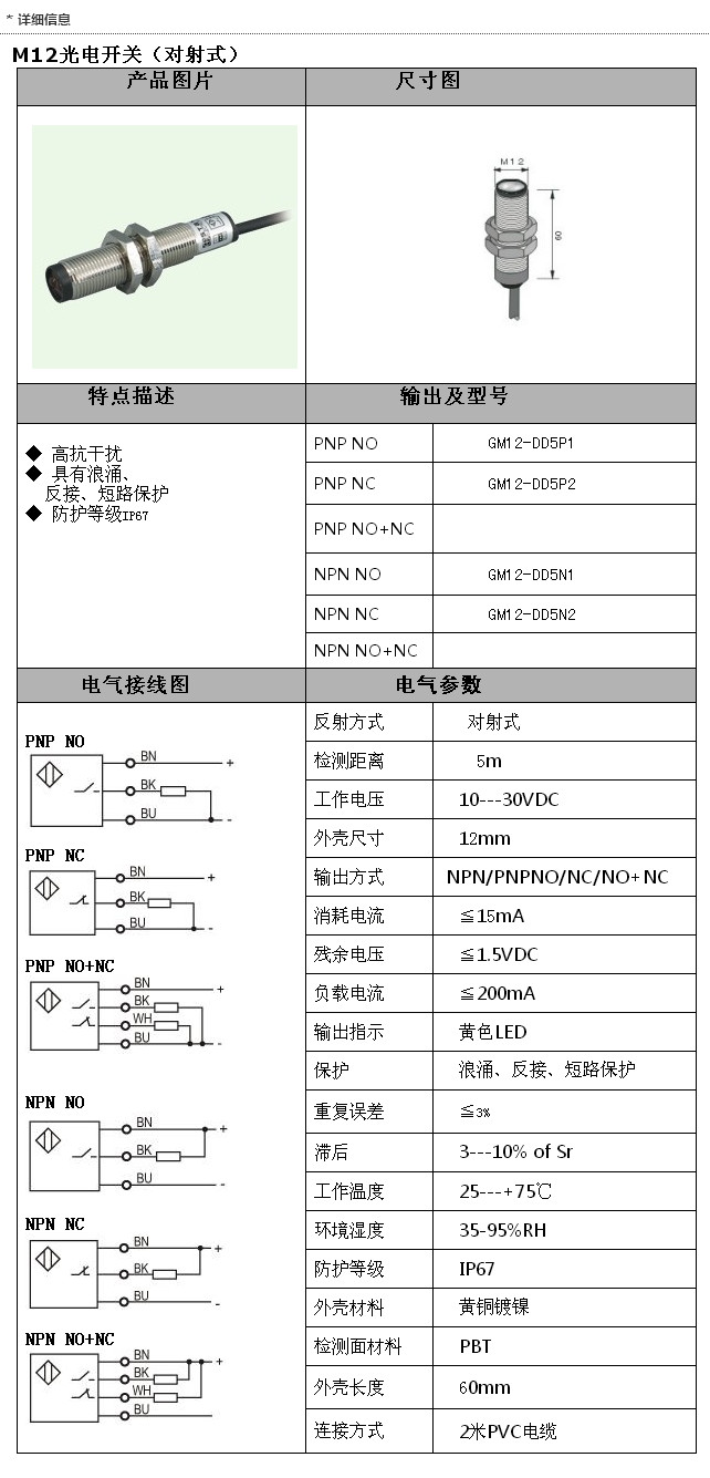 詳細(xì)信息 GM12-DD5P1,GM12-DD5P2,GM12-DD5N1,GM12-DD5N2,M12光電(對(duì)射)