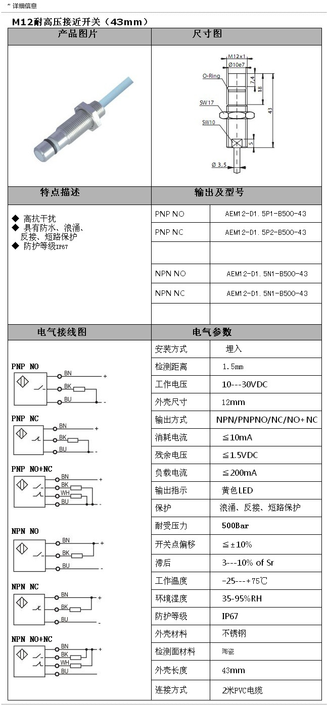 詳細信息 AEM12-D1.5P1-B500-43,AEM12-D1.5P2-B500-43,AEM12-D1.5N1-B500-43,M12引線式(43mm)